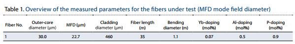 在深入模擬之后,在最近的實驗中生產(chǎn)和檢查了兩種類型的摻 Yb 光纖。光 纖 1 的纖芯直徑為 30μm,并且共摻了磷和鋁。與光纖 1 相比,光纖 2 具有較小的 23μm 直徑,并且共摻水平較低,但含有更多的鐿,以實現(xiàn)略高的折射率分布(見表 1)。