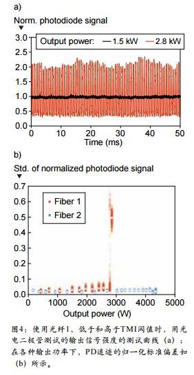 在上述光纖放大器測試期間,使用光電二極管分析的一小部分功率來確定 TMI 閾值。功率波動的發(fā)生相當突然和顯著(見圖 5)。雖然在使用光纖 1 的測試中,這種信號變化是顯著的,但對于光纖 2 的功率水平達到4.3kW 都無法探測到這種情況。相應的斜率如圖 5a 所示。