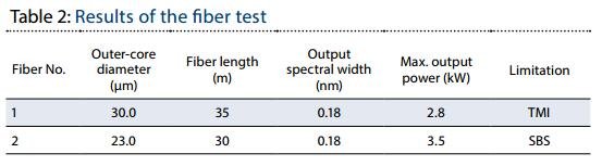 在光纖 1 的測試中,在 2.8kW 的閾值下,在毫秒級上觀察到突然的波動,這可以歸因于 TMI。長度為30m、種子線寬相同的光纖 2,被泵浦到 3.5kW 的輸出功率,受到 SBS而非 TMI 限制。