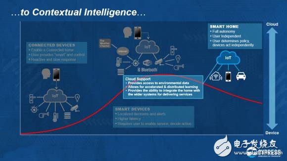“智能革命”的下一步是將計算能力轉(zhuǎn)移到網(wǎng)絡(luò)邊緣,并且從人工決策平臺過渡到能夠自主決策的平臺,從所處的環(huán)境中學(xué)習(xí)并隨時改變其行為。下圖就是我所說的“情境智能”——一個真正不依賴于設(shè)備的環(huán)境。