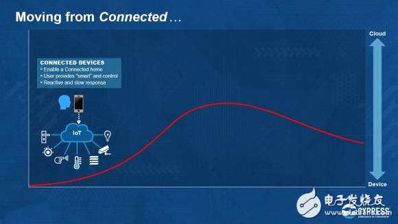 今天,我們生活在一個由互聯(lián)設(shè)備主導(dǎo)的世界。以智能家居為例,“智能”是由使用者通過手機應(yīng)用程序或偏好預(yù)設(shè)等功能(而非家居本身)體現(xiàn)出來的。因此,智能設(shè)備做出的反應(yīng)是被動和遲滯的。下圖中的紅色線條顯示了聯(lián)網(wǎng)設(shè)備的智能化等級,的確有一點智能的意思,但是微不足道。