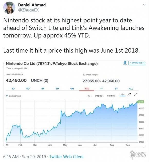 Niko Partners的高級(jí)分析師Daniel Ahmad今天在推特上透露,在Switch Lite發(fā)售和《塞爾達(dá)傳說(shuō):夢(mèng)見島》發(fā)售的雙重利好下,任天堂的股價(jià)已經(jīng)觸及了年初至今的最高點(diǎn)。年初至今,任天堂的股價(jià)已經(jīng)上漲了大約有45%。而上一次任天堂股價(jià)達(dá)到這個(gè)高度還是在2018年6月1日。