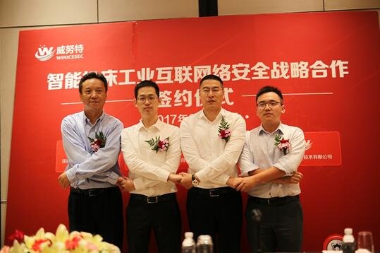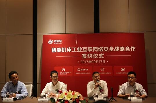 2017年9月17日,2017國家網(wǎng)絡(luò)安全周網(wǎng)絡(luò)安全博覽會暨網(wǎng)絡(luò)安全成就展第一天,智能機床工業(yè)互聯(lián)網(wǎng)絡(luò)安全戰(zhàn)略合作簽約儀式在上海國家會展中心上海洲際酒店隆重舉行,沈機(上海)智能系統(tǒng)研發(fā)設(shè)計有限公司副總經(jīng)理黃云鷹,智能云科信息科技有限公司副總經(jīng)理張曉,神州云盾信息安全有限公司總經(jīng)理周峻和北京威努特技術(shù)有限公司總經(jīng)理龍國東親臨簽約現(xiàn)場,共同進行了簽約儀式并回答了媒體提問。