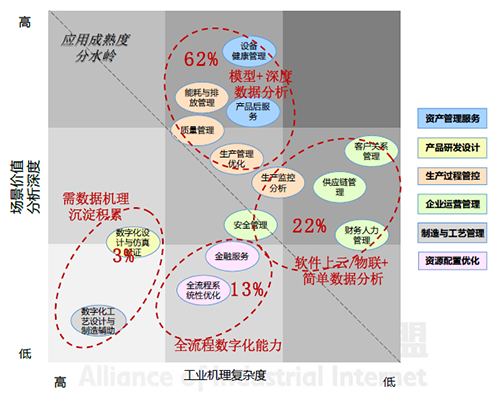 數(shù)據(jù)分析是分水嶺必須要說,數(shù)據(jù)分析的能力等級,是工業(yè)互聯(lián)網(wǎng)是否可以被廣泛應(yīng)用的分水嶺。中國工業(yè)互聯(lián)網(wǎng)產(chǎn)業(yè)聯(lián)盟發(fā)布的《工業(yè)互聯(lián)網(wǎng)平臺白皮書2019 》中指出,“數(shù)據(jù)分析深度與工業(yè)機(jī)理復(fù)雜度”決定了工業(yè)互聯(lián)網(wǎng)平臺的應(yīng)用優(yōu)化價(jià)值和發(fā)展熱度?;谄脚_的“模型+深度數(shù)據(jù)分析”在設(shè)備運(yùn)維、資產(chǎn)管理、能耗管理、質(zhì)量管控、工藝調(diào)優(yōu)等場景被期望獲得大量應(yīng)用;而基于平臺的“軟件上云+簡單數(shù)據(jù)分析”在客戶關(guān)系管理、供應(yīng)鏈管理和部分企業(yè)計(jì)劃資源管理領(lǐng)域獲得應(yīng)用,有效降低中小企業(yè)軟件使用成本。