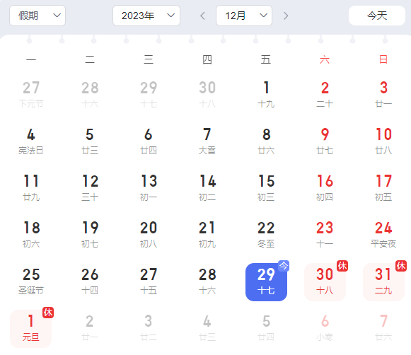 2023年12月30日(星期六)至2024年1月1日(星期一),共放假3天。