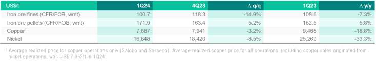 2024年第一季度,鎳產(chǎn)量為3.95萬噸,同比下降4%,主要系昂薩布瑪(Onça Puma)熔爐重建所致,加拿大和印度尼西亞運(yùn)營(yíng)區(qū)業(yè)績(jī)提升部分抵消了這部分影響。