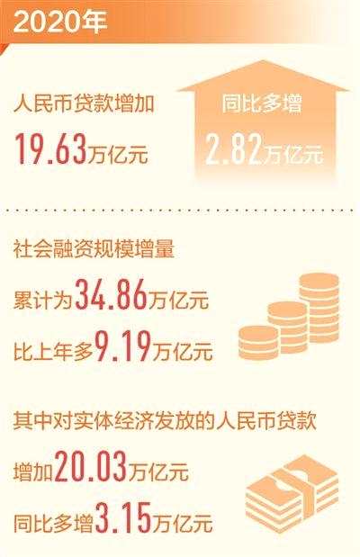 人民銀行發(fā)布的最新數(shù)據(jù)顯示,2020年,我國人民幣貸款增加19.63萬億元,同比多增2.82萬億元,社會融資規(guī)模增量累計(jì)為34.86萬億元,比上年多9.19萬億元,其中對實(shí)體經(jīng)濟(jì)發(fā)放的人民幣貸款增加20.03萬億元,同比多增3.15萬億元。源源不斷的金融活水,讓實(shí)體經(jīng)濟(jì)發(fā)展動力十足。