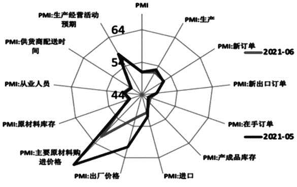 內(nèi)需方面,體現(xiàn)的是國內(nèi)居民消費(fèi)在穩(wěn)步修復(fù)。消費(fèi)回升帶動(dòng)消費(fèi)品制造業(yè)經(jīng)濟(jì)景氣度上行,6月消費(fèi)品制造業(yè)生產(chǎn)新訂單指數(shù)高于上月3.5個(gè)百分點(diǎn),需求擴(kuò)張加快。另外,受疫情影響,新冠疫苗、檢測(cè)試劑等防疫抗疫物資需求旺盛,醫(yī)藥行業(yè)的新訂單指數(shù)也在56%以上。外需方面,PMI新出口訂單反映的外需降溫已持續(xù)3個(gè)月,結(jié)合美國前期或透支了耐用品需求以及后續(xù)服務(wù)業(yè)恢復(fù)對(duì)我國出口支撐較弱,外需拉動(dòng)將繼續(xù)走弱。