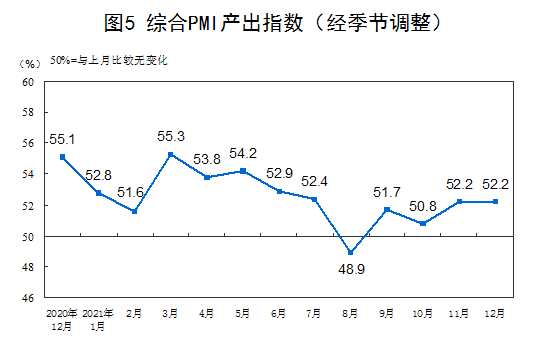 12月份,綜合PMI產(chǎn)出指數(shù)為52.2%,與上月持平,表明我國(guó)企業(yè)生產(chǎn)經(jīng)營(yíng)活動(dòng)總體穩(wěn)定擴(kuò)張。