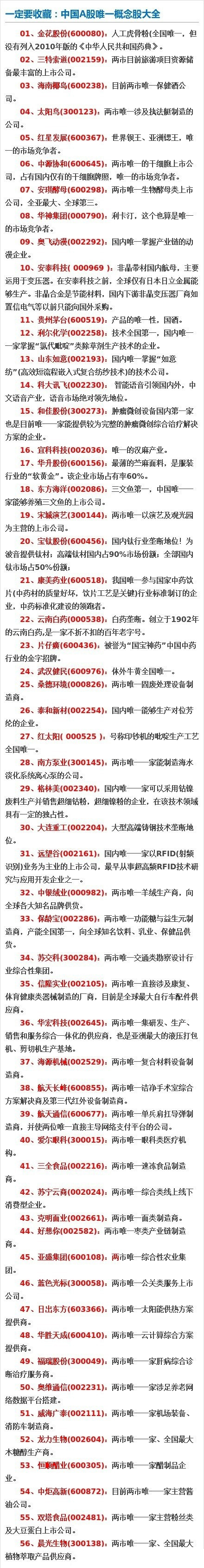 中國A股唯一概念股大全(名單)