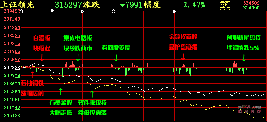 今日三大股指開(kāi)盤(pán)漲跌不一,主板在銀行板塊的帶領(lǐng)下一度上漲,但在創(chuàng)業(yè)板和中小板的加速下跌的影響下,三大股指隨后齊齊下挫,創(chuàng)業(yè)板指一度跌近3%,盤(pán)面毫無(wú)熱點(diǎn),個(gè)股呈現(xiàn)萎靡的態(tài)勢(shì)。午后市場(chǎng)繼續(xù)走低,在流動(dòng)性缺失的影響下,創(chuàng)業(yè)板指跌破2000點(diǎn)整數(shù)關(guān)口。截止收盤(pán),上證綜指收?qǐng)?bào)3152.97點(diǎn),下跌2.47%。
