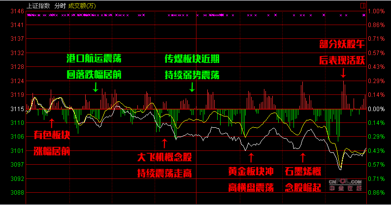 摘要: 今日早盤三大股指開盤小幅下跌,隨后股指開啟震蕩下挫的模式,題材板塊在強勢股、股權(quán)板塊的帶領(lǐng)下稍顯活躍,而中字頭和航運板塊的下跌則拖累滬指再度逼近3100點整數(shù)關(guān)口。午后市場呈現(xiàn)單邊下挫的態(tài)勢,個股紛紛