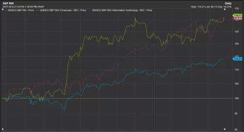 ?。▓D表中藍色表示標普500股票均價,紅色表示標普500中科技股均價,綠色表示金融股均價)