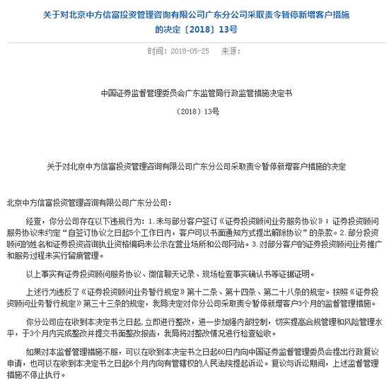 訊北京中方信富投資管理咨詢有限公司廣東分公司存在多項違規(guī),對此,廣東證監(jiān)局采取責(zé)令暫停新增客戶3個月的監(jiān)督管理措施。