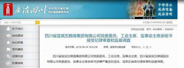 今日(8月24日)晚間,四川省紀(jì)委、監(jiān)察委官網(wǎng)發(fā)布文章援引宜賓市紀(jì)委監(jiān)委消息稱,【五糧液(000858)、股吧】(000858)集團(tuán)有限公司黨委委員、工會(huì)主席、監(jiān)事會(huì)主席,五糧液股份公司黨委委員、監(jiān)事會(huì)主席余銘書涉嫌嚴(yán)重違紀(jì)違法,目前正接受紀(jì)律審查和監(jiān)察調(diào)查。