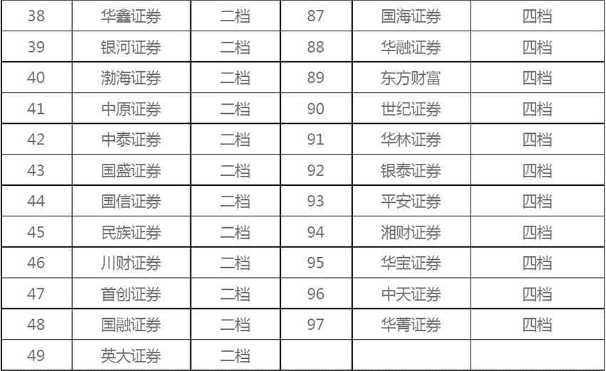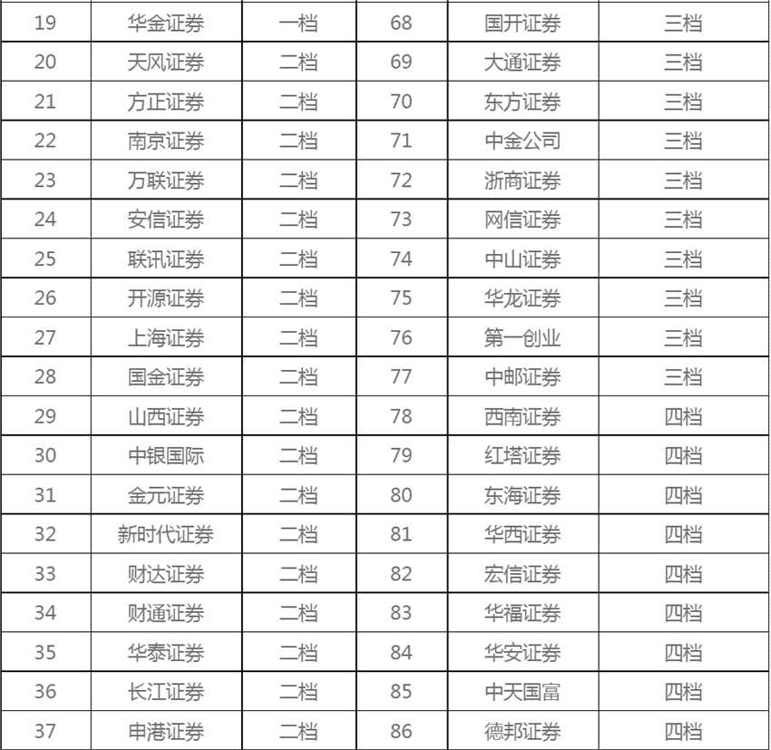 納入評價(jià)的97家主辦券商(其中4家子公司納入母公司合并計(jì)值)中,一檔主辦券商19家。為年度點(diǎn)值排名前20%(含)的主辦券商,其中17家有市場貢獻(xiàn)加點(diǎn),主要為業(yè)務(wù)規(guī)模較大且執(zhí)業(yè)質(zhì)量相對較好的主辦券商,前五名分別為中信建投(601066)、中信證券、申萬宏源、【招商證券(600999)、股吧】、廣州證券。二檔主辦券商39家。為年度點(diǎn)值排名前20%-60%(含)的主辦券商。三檔主辦券商19家。為年度點(diǎn)值排名前60%-80%(含)的主辦券商。四檔主辦券商20家。為年度點(diǎn)值排名80%之后的主辦券商。