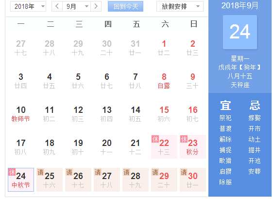 2018年中秋節(jié)是9月24日星期一。