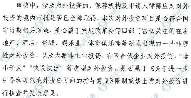 對(duì)于境外投資,審核重點(diǎn)關(guān)注是否已根據(jù)《企業(yè)境外投資管理辦法》取得發(fā)改部門的核準(zhǔn)或備案文件,是否完成商務(wù)部門核準(zhǔn)或備案并取得其頒發(fā)的企業(yè)境外投資證書。