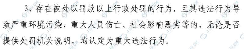 值得注意的是,關(guān)于如何確定是“重大違法行為”,該問答有個(gè)條款非常值得上市公司及中介機(jī)構(gòu)重視:“存在被處以行政處罰的行為,且違法行為導(dǎo)致嚴(yán)重環(huán)境污染、重大人員傷亡、社會(huì)影響惡劣等的,無論是否提供處罰機(jī)關(guān)說明,均認(rèn)定為重大違法行為?!?/p>