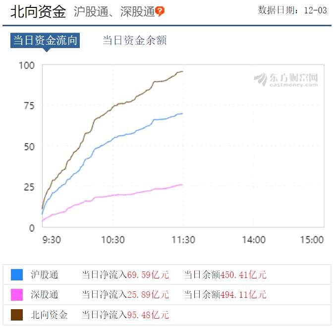 據(jù)數(shù)據(jù),今日上午北向資金合計流入95.48億,超過11月2日同期創(chuàng)下的93.55億元的紀錄。