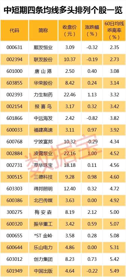 目前兩市共有161只個股5日、10日、20日、60日四條均線近日呈多頭排列。其中順發(fā)恒業(yè)、聯(lián)發(fā)股份、唐山港股價與60日均線的乖離率最小,分別為2.35%、2.73%、3.08%。