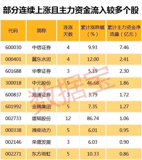 值得注意的是,449只連續(xù)上漲個股中,7只個股期間主力資金累計凈流入超過億元。其中,累計資金流入最多的為中信證券,主力資金累計流入7.46億元。