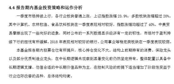 不少優(yōu)秀的基金經(jīng)理的一季度投資路徑也市場關(guān)注。如曹名長管理的中歐恒利,在一季度繼續(xù)維持保持高倉位。在一季度延續(xù)了相對穩(wěn)健的投資策略且配置相對分散和均衡,在食品飲料、醫(yī)藥、地產(chǎn)等領(lǐng)域的布局取得了一定的漲幅。
