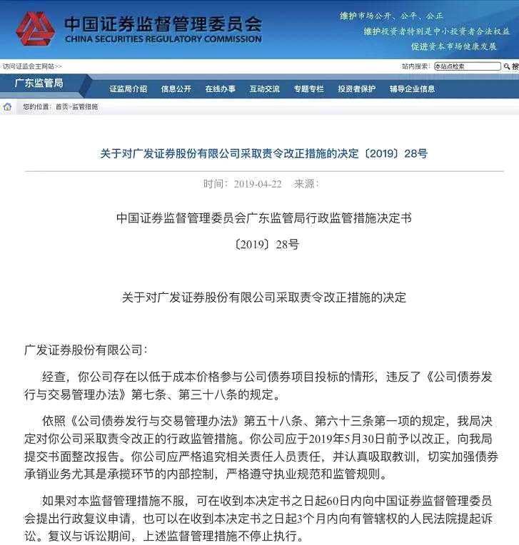 4月22日,因存在以低于成本價(jià)格參與公司債券項(xiàng)目投標(biāo)的情形,【廣發(fā)證券(000776)、股吧】被廣東證監(jiān)局下達(dá)了責(zé)令改正的行政監(jiān)管措施。
