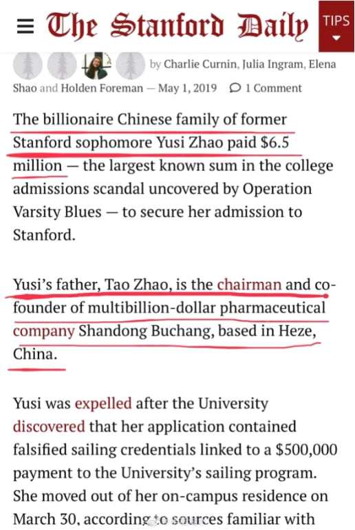 據(jù)《洛杉磯時(shí)報(bào)》和《每日郵報(bào)》報(bào)道,有一個(gè)來(lái)自中國(guó)的家庭,向中介支付了650萬(wàn)美元(約合4300萬(wàn)元人民幣)用以行賄,將其女兒送入美國(guó)斯坦福大學(xué),這一金額在所有賄賂案例中位列最高。涉事學(xué)生名叫Yusi“Molly”Zhao(趙雨思),其父親是A股上市公司步長(zhǎng)制藥董事長(zhǎng)趙濤。趙雨思的簡(jiǎn)歷中被指?jìng)卧炝朔\(yùn)動(dòng)員的身份,事發(fā)后,她在今年3月底離開(kāi)斯坦福大學(xué)。