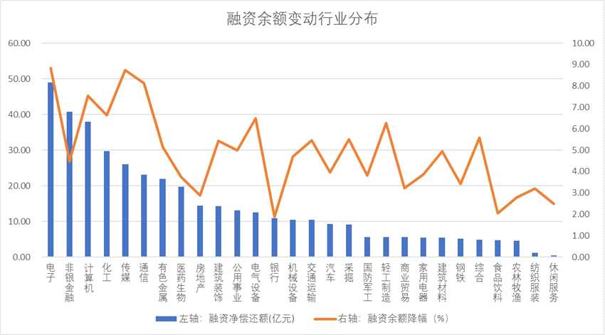 4月25日至5月6日期間,兩市融資余額由9822.59億元下降至9419.57億元,降幅4.10%。分行業(yè)來(lái)看,電子、非銀金融、計(jì)算機(jī)業(yè)遭融資客大手筆拋售,融資余額分別下降49.05億元、40.73億元、38.01億元。從下降比例來(lái)看,電子業(yè)仍然居首,達(dá)8.85%;傳媒、通信行業(yè)融資余額降幅居前,分別為8.75%、8.13%。銀行業(yè)相對(duì)穩(wěn)健,融資余額僅下降1.87%,食品飲料、休閑服務(wù)、農(nóng)林牧漁、房地產(chǎn)業(yè)融資余額降幅也均不足3%。