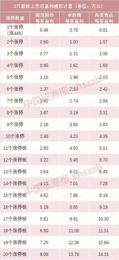 如果國茂股份、卓勝微、西麥食品3只新股上市后,能達到今年以來上市新股的平均水平——7個漲停板的話,則每簽獲利分別約為1.61萬元、2.74萬元、2.84萬元。