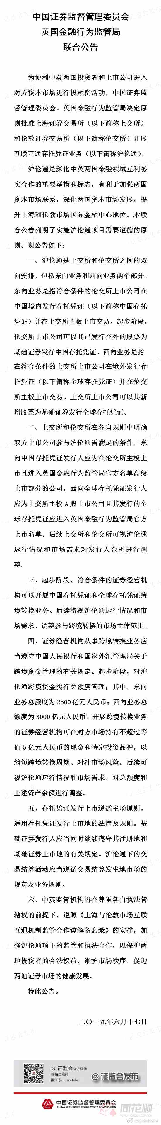 摘要: 證監(jiān)會(huì)17日發(fā)布《中國(guó)證券監(jiān)督管理委員會(huì)英國(guó)金融行為監(jiān)管局聯(lián)合公告》。起步階段,對(duì)滬倫通跨境資金實(shí)行總額度管理;其中,東向業(yè)務(wù)總額度為2500億元人民幣;西向業(yè)務(wù)總額度為3000億元人民幣。開展跨境轉(zhuǎn)