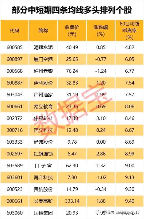 截至6月26日,61只個股5日、10日、20日、60日四條均線近日呈多頭排列。其中海螺水泥、廈門空港、瀘州老窖股價(jià)與60日均線的乖離率最小,分別為4.82%、6.05%、6.77%。