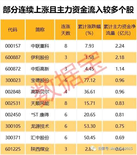值得注意的是,114只連續(xù)上漲個股中,3只個股期間主力資金累計(jì)凈流入超過億元。其中,累計(jì)資金流入最多的為中聯(lián)重科,主力資金累計(jì)流入2.24億元。
