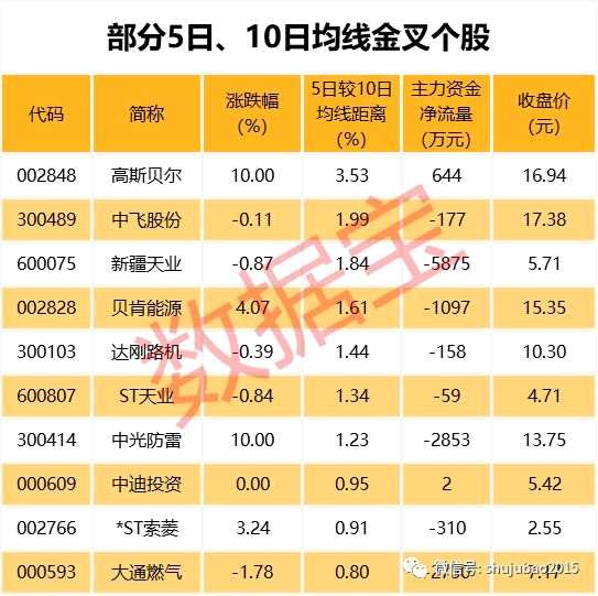 截至6月26日收盤,有47只A股的5日均線主動上穿10日均線,其中高斯貝爾、中飛股份、新疆天業(yè)等個股的5日均線較10日均線距離最大,分別達(dá)3.53%、1.99%、1.84%。