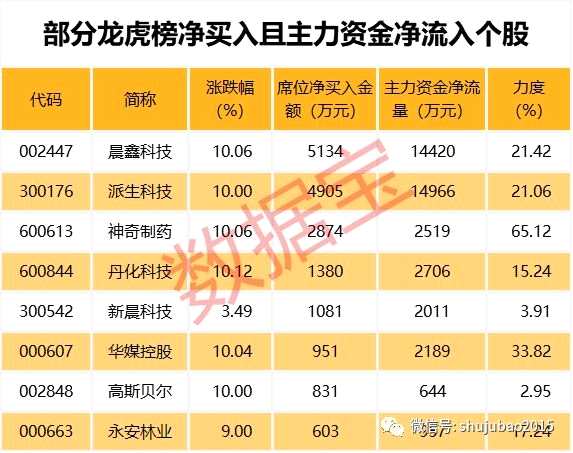 從盤口資金流向來看,主力資金凈流入超千萬且龍虎榜凈買入個股共有6只,其中派生科技、晨鑫科技、丹化科技等個股資金凈流入金額最大。凈流入力度最大的個股有神奇制藥、華媒控股、晨鑫科技,凈流入力度分別為65.12%、33.82%、21.42%。