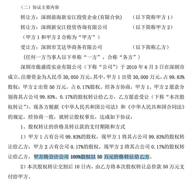 7月23日公告顯示,傲盛霞的股東新安江合伙、新安江咨詢于7月18日與馬偉進(jìn)旗下的深圳市艾達(dá)華商務(wù)有限公司(下稱“深圳艾達(dá)華”)簽訂了關(guān)于轉(zhuǎn)讓傲盛霞100%股權(quán)的《股權(quán)轉(zhuǎn)讓協(xié)議》,股權(quán)轉(zhuǎn)讓價格合計50萬元。