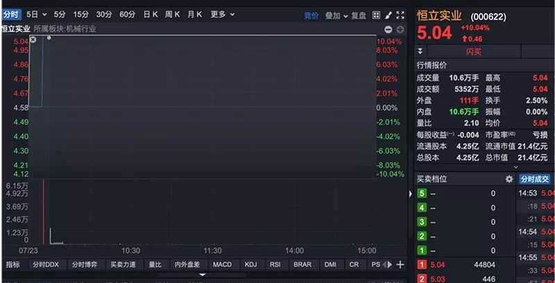 7月23日,恒立實業(yè)開盤漲停,全天成交額5352萬元,收盤封于5.04元/股的漲停板之位,總市值升至21.4億元。