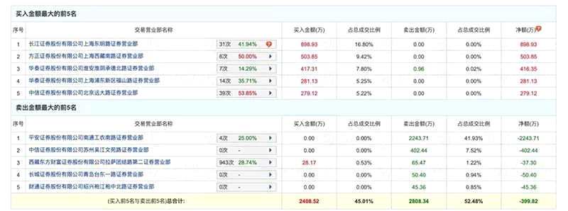 7月23日龍虎榜顯示,“賣一”平安證券南通工農(nóng)南路營業(yè)部合計賣出2243.71萬元,“賣二”【中信證券(600030)、股吧】蘇州吳江文苑路營業(yè)部賣出402.44萬元。