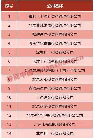 值得注意的是,上述公司名單里還包括了14家私募基金管理人,主要集中在北京和上海私募。這14家私募中,濟南華爾泰富投資管理有限公司、深圳禮一投資有限公司、天津豐利創(chuàng)新投資有限公司、藍(lán)海思通投資控股(上海)有限公司和青島東海恒信投資管理有限公司目前已經(jīng)無法查詢到私募管理人登記信息,有些應(yīng)該是已被協(xié)會注銷。