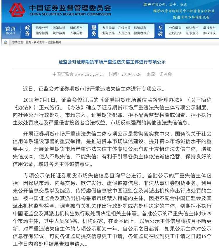 中國證監(jiān)會近日對證券期貨市場嚴(yán)重違法失信主體進行了專項公示。據(jù)悉,首批公示的嚴(yán)重失信主體共629個市場主體,其中人員563名,機構(gòu)66家。