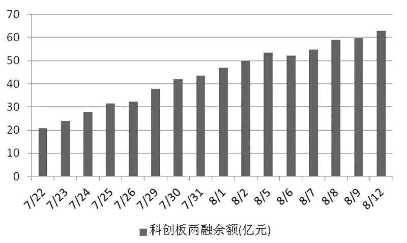 7月22日科創(chuàng)板開市首日,首批25只股票兩融余額報(bào)20.71億元;8月12日,在后續(xù)僅迎來(lái)3只新股的背景下,科創(chuàng)板兩融余額已經(jīng)升至62.93億元。