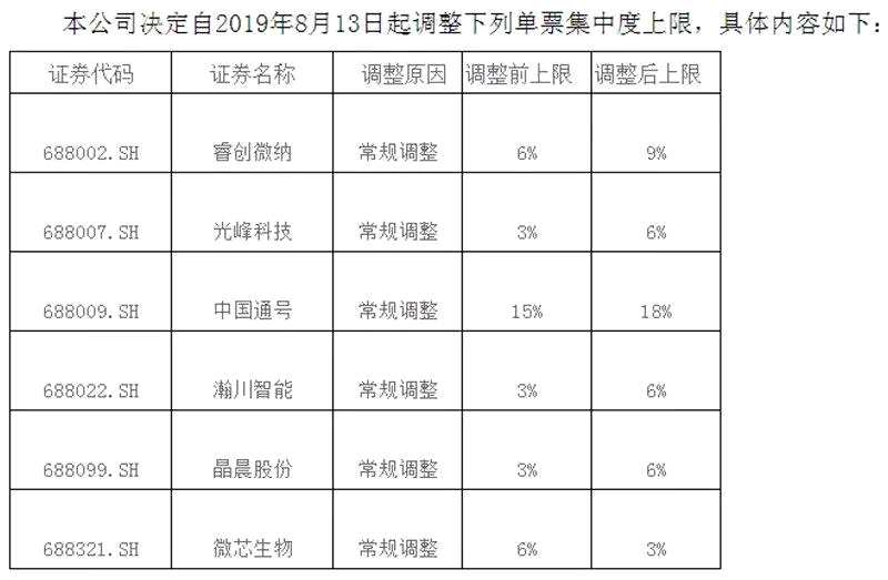 東方證券規(guī)定,自8月13日起,上調(diào)睿創(chuàng)微納、光峰科技、中國(guó)通號(hào)等6只科創(chuàng)板股票的單票集中度上限,其中,中國(guó)通號(hào)單票集中度上限從15%調(diào)高至18%。