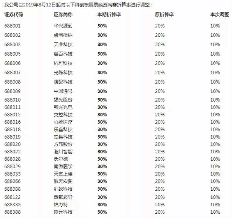 海通證券近日也發(fā)布通知,自8月12日起,調(diào)整24只科創(chuàng)板股票的融資融券折算率,從20%上調(diào)至30%。(注釋:提高折算率也會(huì)間接提升杠桿,假設(shè)有100萬(wàn)元某科創(chuàng)板股票,20%的折算率下,折算為20萬(wàn)元保證金,30%的折算率下,可折算為30萬(wàn)元保證金。)