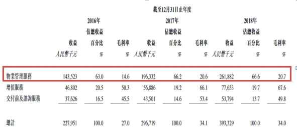 具體而言,報告期內,公司逾六成以上的收益來源于物業(yè)管理服務,2016年-2018年,集團物業(yè)管理服務收益分別約1.44億元、1.96億元、2.62億元,分別占總收益的63.0%、66.2%、66.6%。