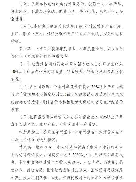 另外,針對(duì)上市公司的海外業(yè)務(wù),《通知》也給出了要求:報(bào)告期內(nèi)上市公司從事鋰電池產(chǎn)業(yè)鏈相關(guān)業(yè)務(wù)的海外銷售收入占同期營業(yè)收入30%以上的,應(yīng)當(dāng)在年度報(bào)告、半年度報(bào)告中披露主要收入來源地、產(chǎn)品名稱、銷售量、銷售收入、回款情況、報(bào)告期內(nèi)當(dāng)?shù)匦袠I(yè)政策、匯率或貿(mào)易政策是否發(fā)生重大不利變化,如是,應(yīng)當(dāng)披露對(duì)公司當(dāng)期和未來經(jīng)營業(yè)績的影響情況。