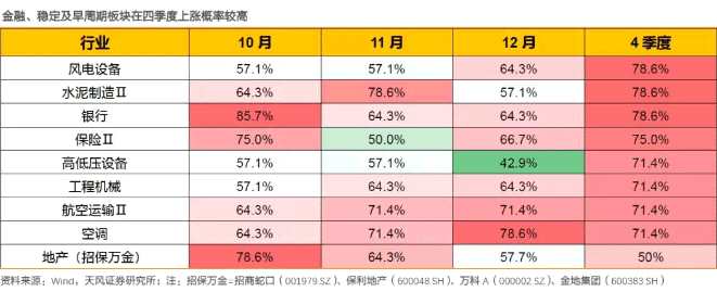 統(tǒng)計(jì)結(jié)果顯示,四季度表現(xiàn)較好的行業(yè)集中、業(yè)績(jī)經(jīng)營(yíng)比較穩(wěn)定及早周期板塊,上漲概率達(dá)到70%以上的行業(yè)包括風(fēng)電設(shè)備、水泥制造、銀行、保險(xiǎn)、高低壓設(shè)備、工程機(jī)械、航空運(yùn)輸、空調(diào)等行業(yè)。
