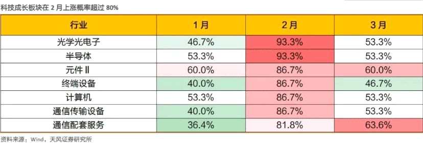 在春季行情方面,天風(fēng)證券表示,雖然上述業(yè)績(jī)穩(wěn)定的板塊在前期保持占優(yōu),但進(jìn)入2月后,元件、半導(dǎo)體、計(jì)算機(jī)、光學(xué)光電子、通信傳輸設(shè)備、通信配套服務(wù)、終端設(shè)備等科技成長(zhǎng)板塊顯著好于其他板塊。值得關(guān)注的是,上述行業(yè)在2月當(dāng)月的上漲概率高達(dá)80%以上。