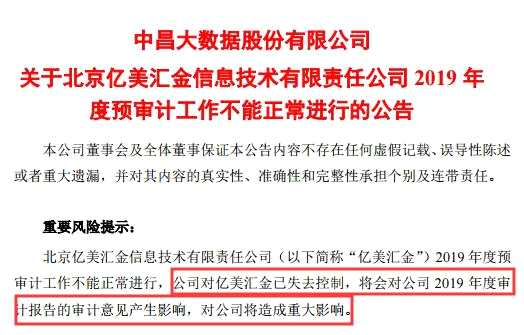 億美匯金失去控制事項(xiàng),將會(huì)對(duì)公司2019年度審計(jì)報(bào)告的審計(jì)意見(jiàn)產(chǎn)生影響,對(duì)公司將造成重大影響。2019年前三季度億美匯金歸屬上市公司凈利潤(rùn)占公司2019年前三季度歸母凈利潤(rùn)比例為59.69%。億美匯金失去控制后,若2019年不納入公司合并報(bào)表范圍,會(huì)對(duì)公司2019年度財(cái)務(wù)報(bào)表產(chǎn)生重大影響。說(shuō)的直白一點(diǎn),占凈利近6成的億美匯金如不能納入合并報(bào)表,中昌數(shù)據(jù)2019年度的財(cái)報(bào)也恐"爆雷"。