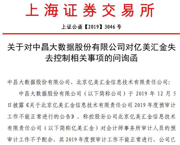 對(duì)此,上交所12月5日晚間火速向中昌數(shù)據(jù)下發(fā)問(wèn)詢函,要求公司說(shuō)明億美匯金失控后公司采取了何種措施以及后續(xù)措施,前期是否能夠?qū)嶋H控制億美匯金,億美匯金的決策機(jī)制,億美匯金做出不配合上市公司預(yù)審計(jì)工作決定的決策者。
